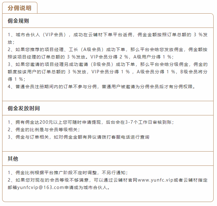 佣金规则说明及解释权永久归武汉市云辅材科技有限公司